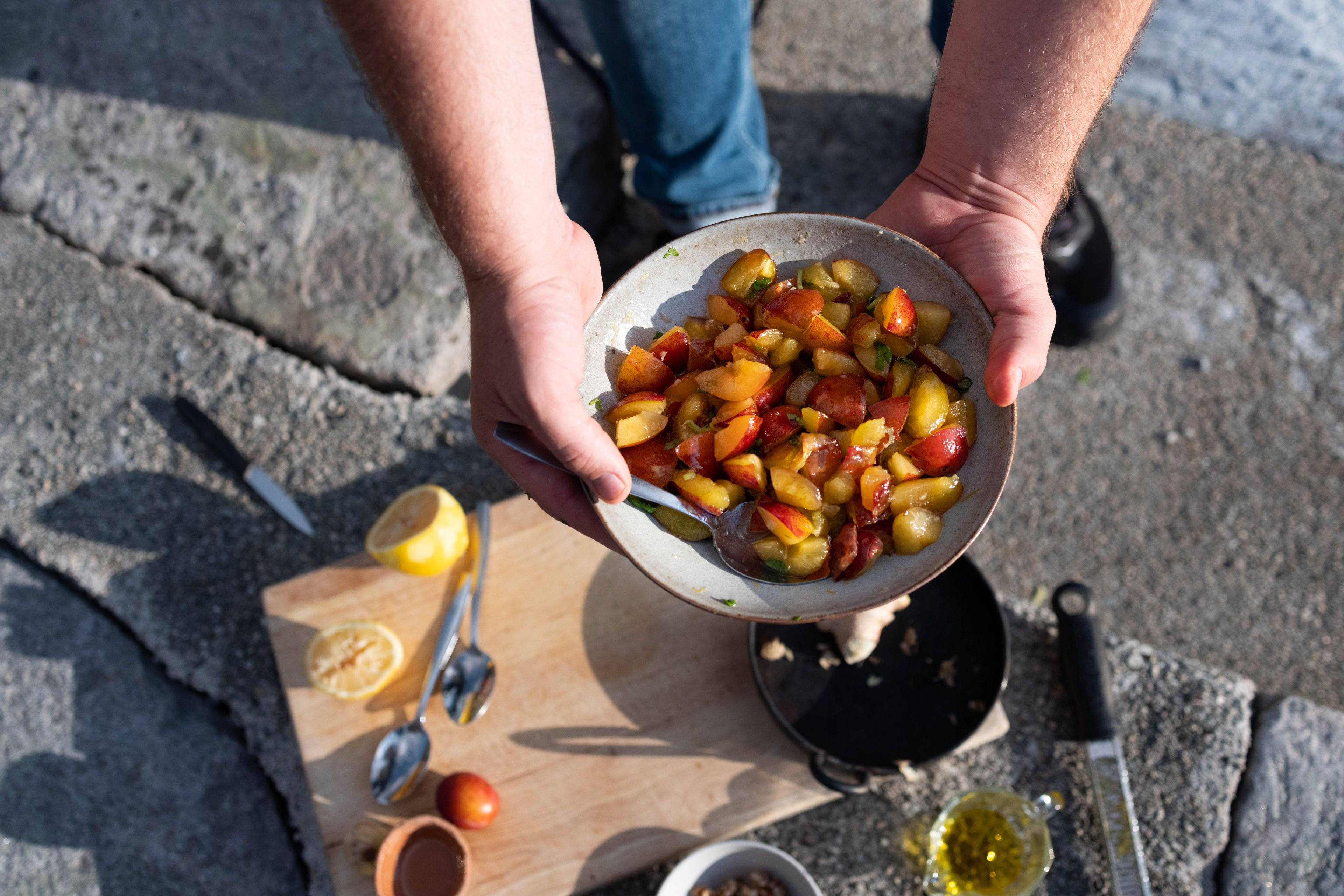 - Skyll og tørk plommene. Del plommene i to, og fjern steinene. Del plommene i terninger.